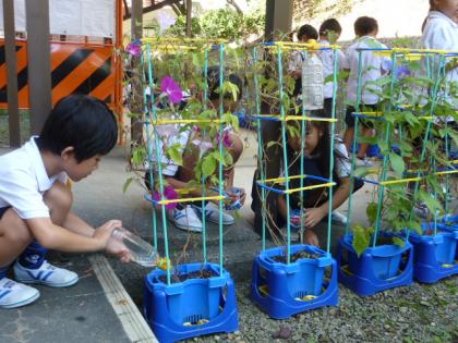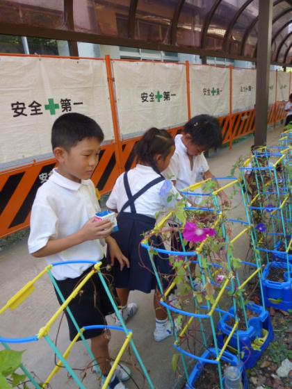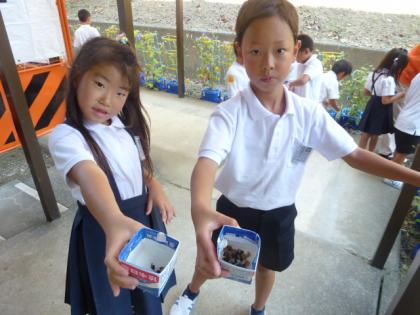 体育館へ行くわたり廊下には、1年生の一人ひとりが育てたアサガオのプランターが並べられています。今日、子ども達は自分のプランターから、ていねいに種を探し慎重にもぎ取っていました。