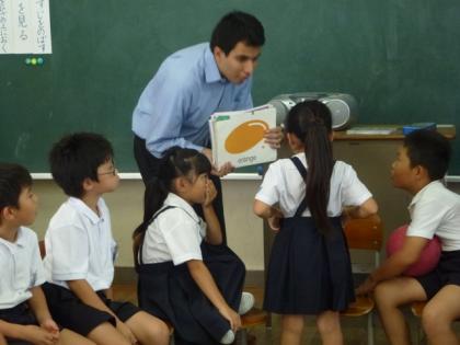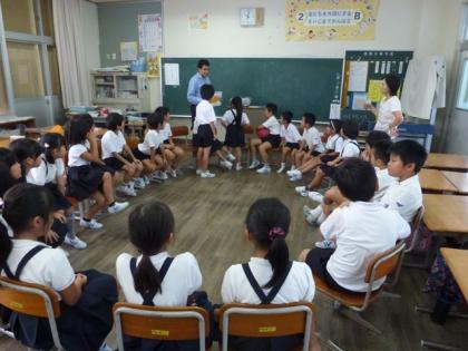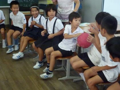 2年生の教室では、ALTのアルバート先生のリードで英語の学習をしていました。今回は、子ども達が円形に座り、音楽が鳴っている間、ボールを回していきます。音楽が止まったところで、ボールを持っている人がアルバート先生から「この色は何ですか」等の質問を受け、答えるというゲーム形式で学習していました。