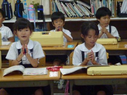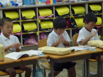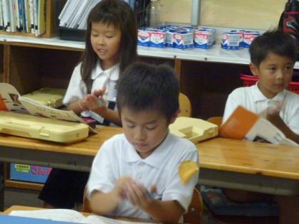 B組は、「おもちゃのチャチャチャ」を歌とカスタネットで表現していました。 A組は、鍵盤ハーモニカで、きれいな音の出し方を学習していました。