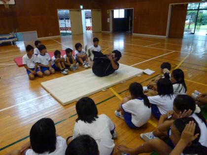 写真上:先生が、回転の姿勢を見せるね!