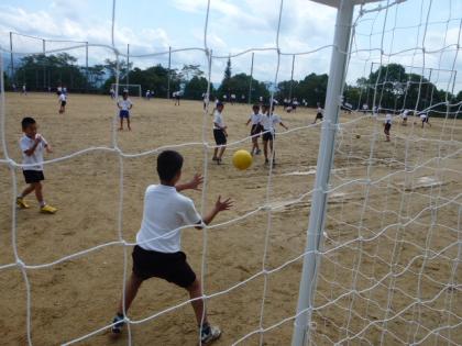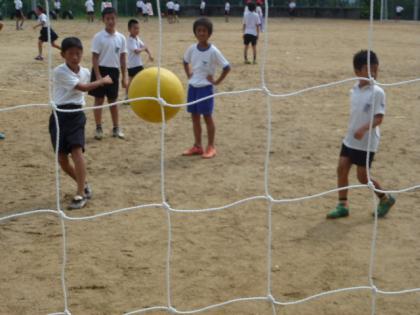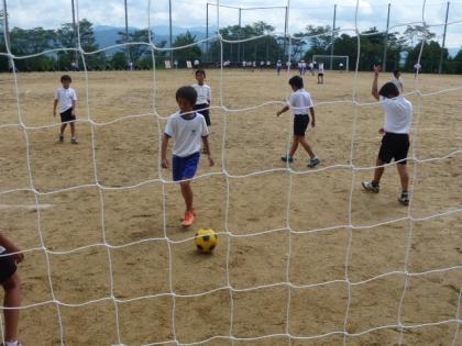 雨上がりのグランド。少々のぬかるみも何のその。新しくなったサッカーゴールと網に向かってナイスシュート。いつも感じるのですが、休憩時間の子ども達の笑顔は最高です。