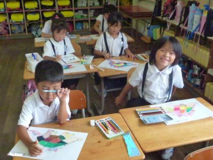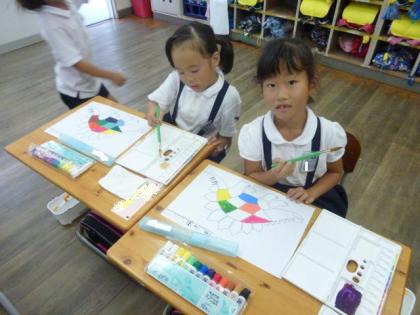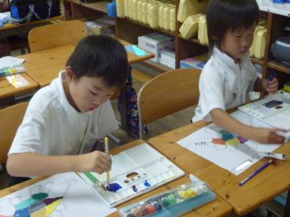 もうひとつのクラスでは、絵の具を2色以上混ぜて、好みの色を作り出し、その色を枠内に、はみ出さないよう丁寧に塗っていました。
