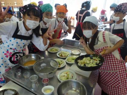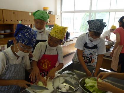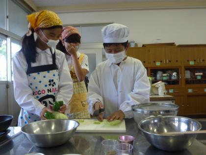 写真上:キャベツを切る手元を見つめちゃうね。あごにマスクなのはお見逃しを。