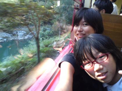 トロッコ列車に揺られて、亀岡駅から嵯峨駅まで、保津川下りの船を眺めたり、友達とお喋りを楽しみました。
