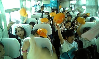 バスの中はライブハウス状態です。全員元気で、順調に進んでいます。