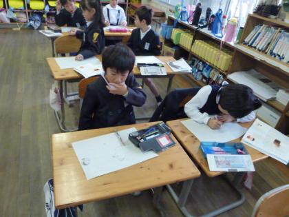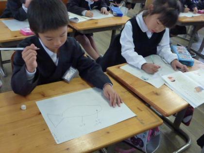 写真上:うーん、描くのは難しいなあ。