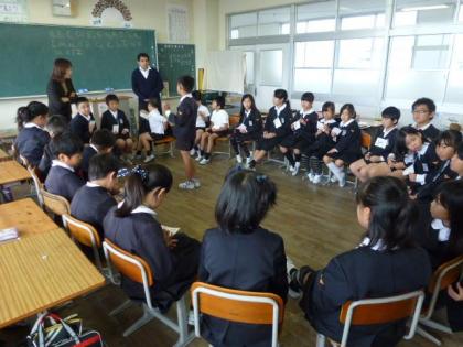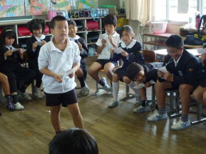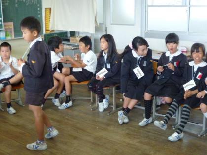 4年生では英語の学習をしていました。フルーツバスケットのルールで、鬼が自分の名前にあるアルファベット1文字をみんなにつげ、そのアルファベットが自分の名前に入っていれば、いすを離れ違ういすへ座りに行く、というゲーム形式ですすめていました。みんな、とても楽しみながら英語の学習をしていました。