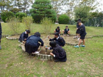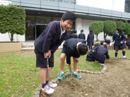写真上:栽培委員会は、花を埋めるために花壇を耕したよ。