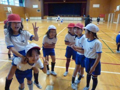 写真上:体育のあとです。お友だちもそろって笑顔です。