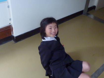 中:廊下を拭き掃除中です。転んでも笑顔だよ。