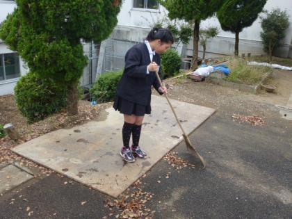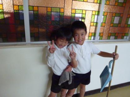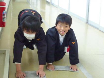 中:廊下掃除中の二人。北玄関をきれいにしてくれました。