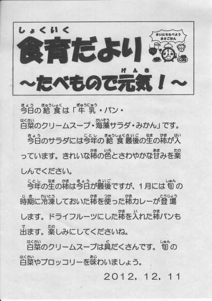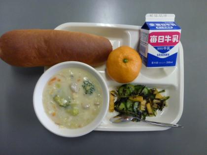 今日の献立は、パン、白菜のクリームスープ、海草サラダ、みかん、牛乳です。