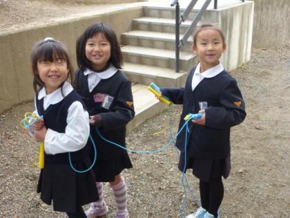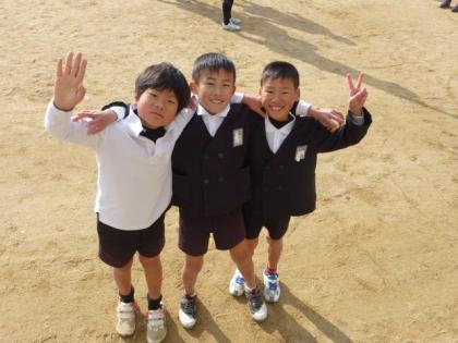 写真上:「イエーイ。」仲良し三人組です。