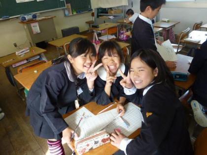写真上:英語の時間。楽しそうな三人組を発見。
