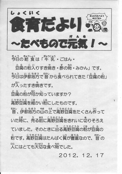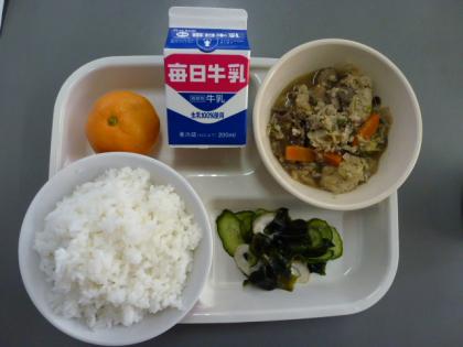 今日の献立は、ごはん、とふのこ(豆腐の粉)入りスキヤキ、酢の物、みかん、牛乳です。ごちそうさまでした。(*^_^*)