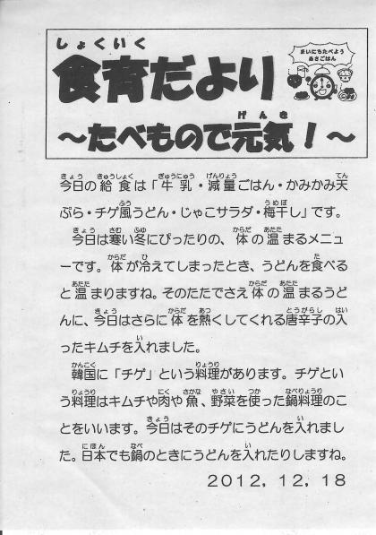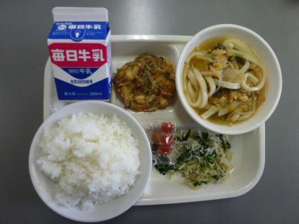 今日の献立は、減量ごはん、かみかみ天ぷら、チゲ風うどん、じゃこサラダ、梅干し、牛乳です。ごちそうさまでした。(*^_^*)