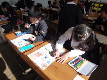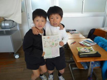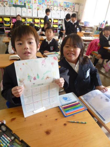 1年生は、むかし遊びを教えてくれたおじいちゃんやおばあちゃんにお礼のカレンダーを制作しました。