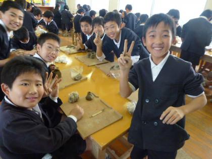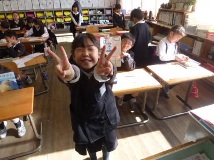 写真上:1年生の教室でとってもいい笑顔を発見。