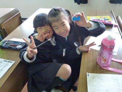 中:朝礼台の前で遊ぶ3年生を見つけたよ。