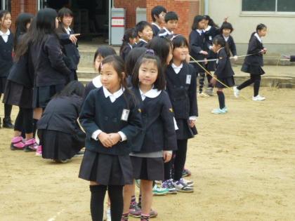 写真上:低学年だって負けていません。元気に縄跳びしましょう。