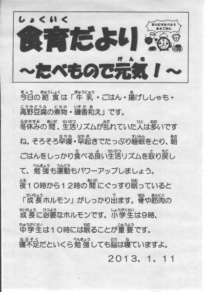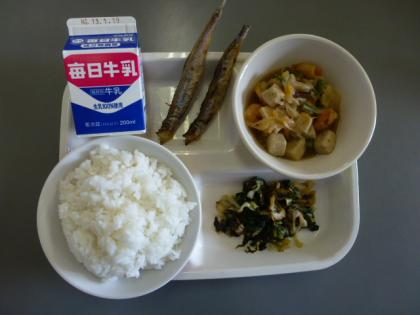 今日の献立は、ごはん、揚げししゃも、高野豆腐の煮物、磯香和え、牛乳です。