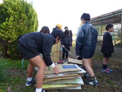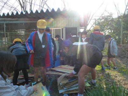 下:集めたダンボールは束ねてごみ用倉庫に持っていくよ。