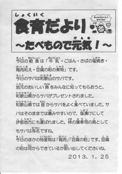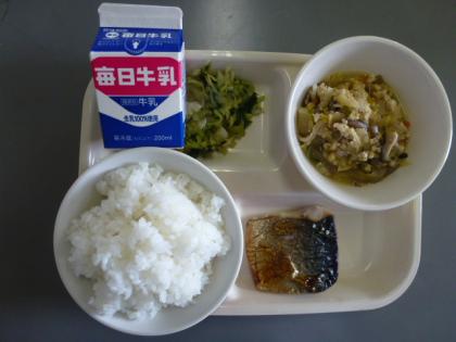 今日の献立は、ごはん・サバの塩焼き・梅肉和え・豆腐の粉(とふのこ)の煮物・牛乳です。ごちそうさまでした(*^_^*)