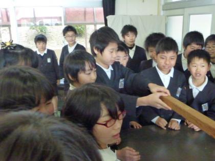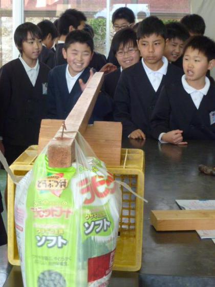 写真上:だんだんわかってきたぞ。支点をおもりに近づけると手ごたえが軽くなるんだ。