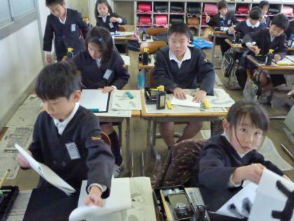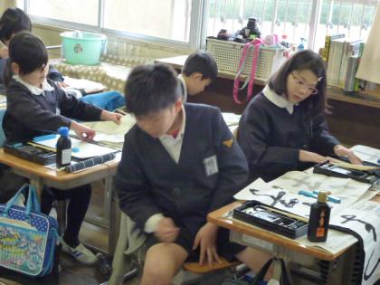 写真上:毛筆は難しいなぁ。