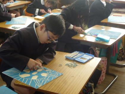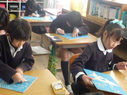 下:彫刻刀を上手に使って、手を切らないようにね。