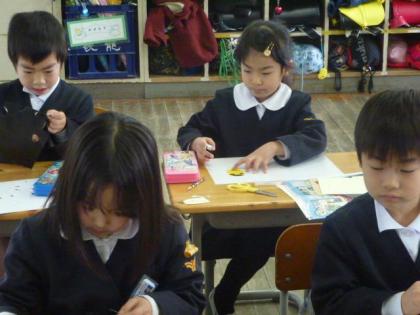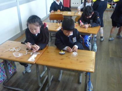 昔あそびにチャレンジした1年生は、自分用のコマを作っています。