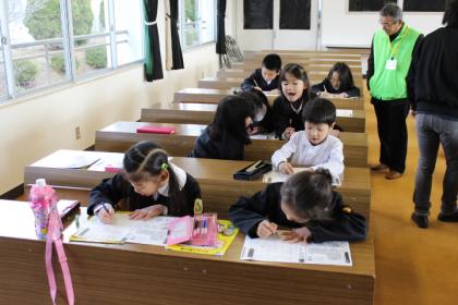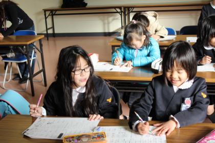 写真上:お友達と漢字の勉強。いつもより漢字の学習が楽しいね。