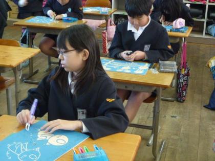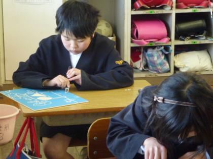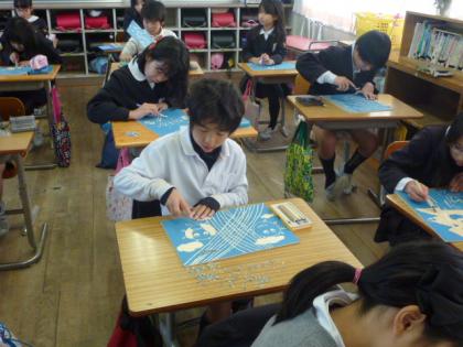 4年生の図工は、ただ今木版画の作成中です。最初は彫刻刀を使うのもこわごわ、慣れない手つきでしたが、今では手慣れたもので、順調に彫り進められていました。