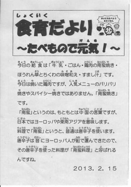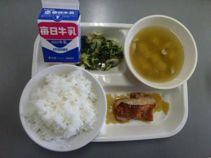 今日の献立は、ごはん・鶏肉の南蛮焼き・ほうれん草と竹輪の味噌和え・すまし汁・牛乳でした。ごちそうさまでした(*^_^*)