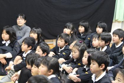 「二月六日は、かげ絵を見せてくれて、ありがとうございました。一番すごいと思ったのが、モチモチの木のかげ絵です。じさまをせっちんに毎回つれていってたところがおもしろかったです。もうひとつおもしろかったのが、おにのパンツです。パンツをはいたとき、あったかかったです。また、城山小学校に来て見してください。」S・Nくん