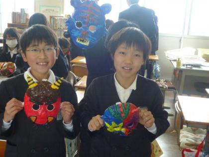 写真上:5年生はお面を作っています。素敵なのができあがったよ。