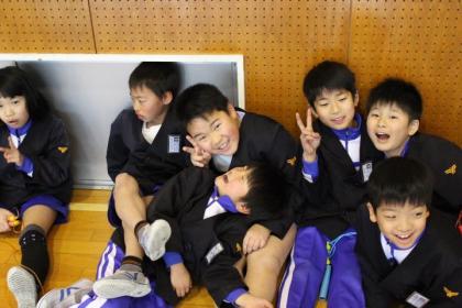 中:いっぱいのピースサイン。4年生です。