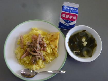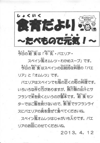 パエリア・スペイン風オムレツ・わかめスープ・牛乳。ごちそうさまでした。