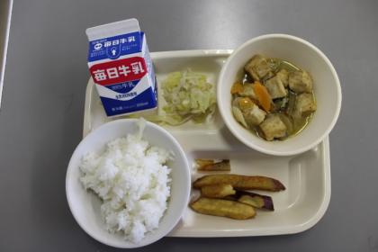 今日の献立は、ごはん・豚肉と厚揚げのみそ煮・はりはり漬け・みつおさつ・牛乳です。ごちそうさまでした。(*^_^*)