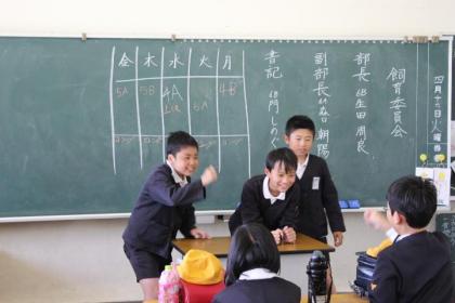 写真上:飼育委員会。当番の争奪戦でしょうか?「じゃんけんほいっ!」
