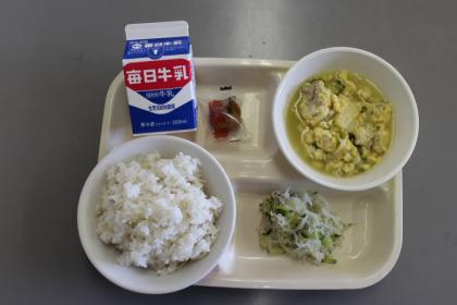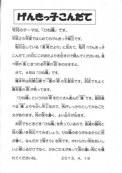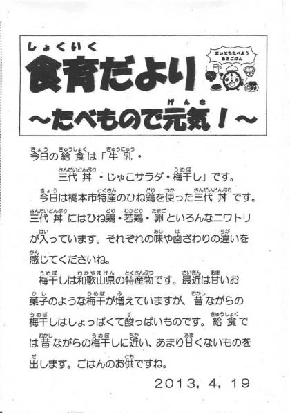 今日は、毎月設けられる『げんきっ子こんだて』の日です。4月のテーマは「ひね鶏」で、今日の献立は三代丼・じゃこサラダ・梅干し・牛乳です。ごちそうさまでした。(*^_^*)
