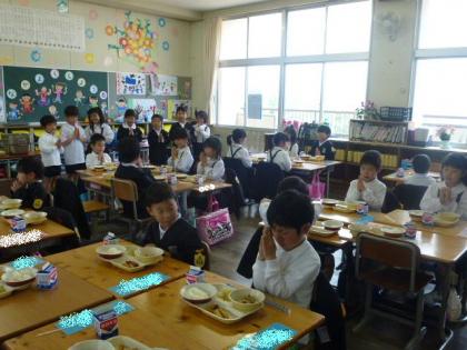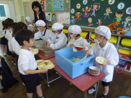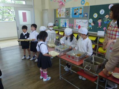 写真上:初めての当番さんは緊張の連続です。なかなか上手ですよ。