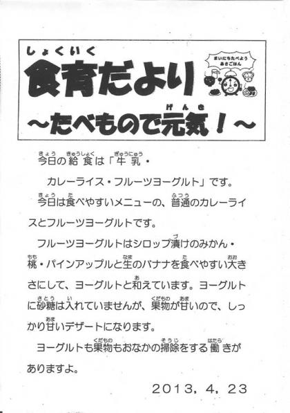 今日の給食は、カレーライス・フルーツヨーグルト・牛乳です。ごちそうさまでした。(*^_^*)        本日画像はありません。ごめんなさいm(_ _)m