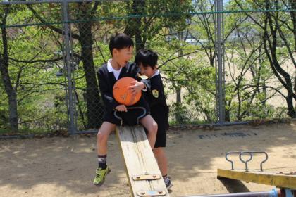 写真上:ボールでも遊びたい、シーソーもしたい!遊びに関しては欲張るくらいが楽しいよね!