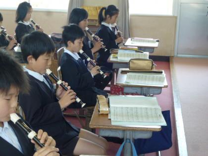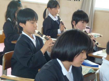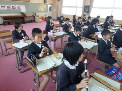 音楽室前の廊下にもれ聞こえてくるリコーダーのしらべ。とはいかないまでも、初めての曲でしたが、なかなか上手に吹けていました。ちなみに曲は「歌のにじ」でした