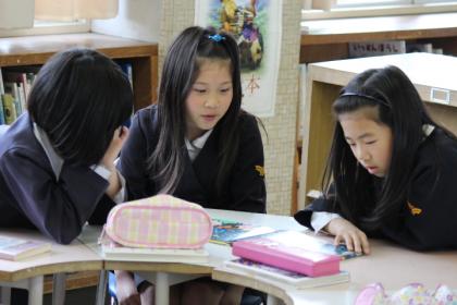 写真上:3人で1冊の本を読んでいるんだ。