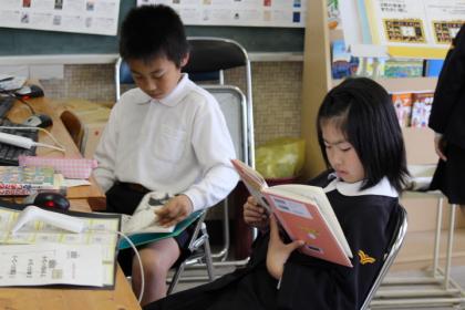 図書室を覗いてみました。4年生がそれぞれ好みの本を選び、好きな場所で、好きな友達と一緒に読んでいました。城山小学校の図書室は蔵書が多く、きちんと整理され、季節毎に飾り付けが変わるなど、自慢のひとつです。ちなみに、1ヶ月に1度、図書ボランティアさん(地元の有志)が来てくださり、飾り付けや整理、本の修理等をしてくださっています。いつもありがとうございます。