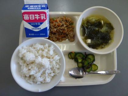今日の献立は、肉そぼろごはん・キュウリの昆布和え・味噌汁・牛乳です。ごちそうさまでした。(*^_^*)