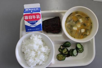今日の献立は、ごはん・サバの竜田揚げ・きゅうりの昆布和え・かぼちゃの味噌汁・牛乳です。ごちそうさまでした。(^^)/