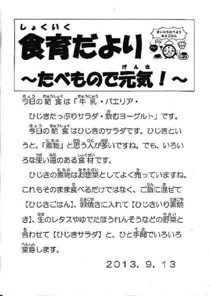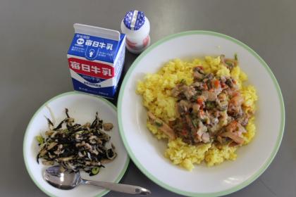 今日の献立は、パエリア・ひじきたっぷりサラダ・飲むヨーグルト・牛乳です。ごちそうさまでした。(^^)/